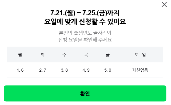 - 요일제 적용: 7/21~7/25는 출생연도 끝자리에 따라 신청