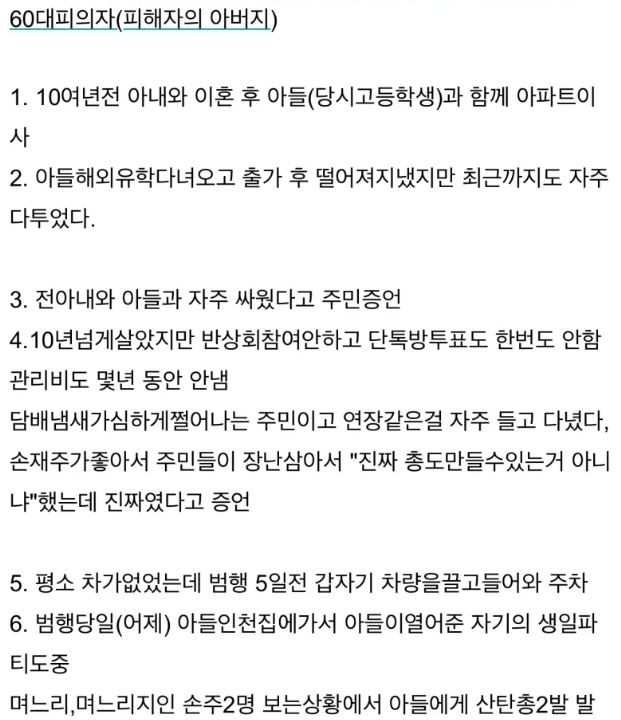 - 아들과의 직접적인 갈등 여부는 명확하지 않으나, 전문가들은 “배우자(전 부인)에게 복수하려는 목적”이었을 가능성을 제기하고 있습니다.